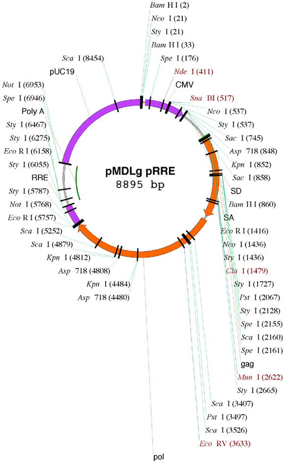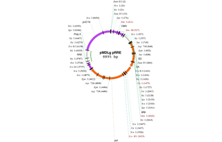 This 3rd generation LV packaging plasmid includes gag, coding for the virion main structural proteins; pol, responsible for the retrovirus-specific enzymes; and RRE, a binding site for the Rev protein which facilitates export of the RNA from the nucleus. This plasmid does not include Rev. The third generation packaging system offers maximal biosafety but is more cumbersome, as it involves the transfection of four different plasmids in the producer cells.