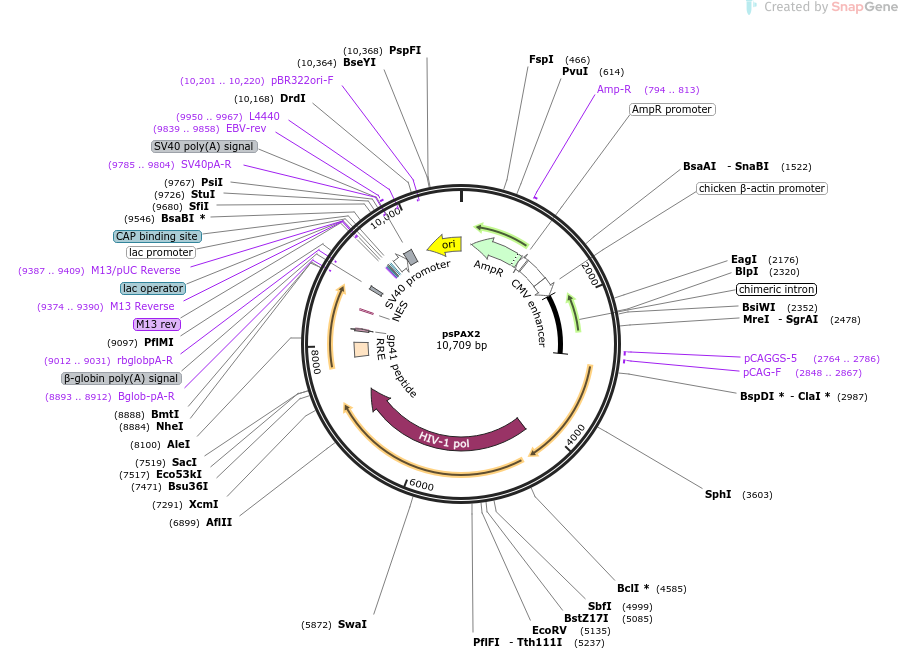 Plasmid#12260Purpose2nd generation lentiviral packaging plasmid. Can be used with 2nd or 3rd generation lentiviral vectors and envelope expressing plasmid (Addgene#12259)DepositorTypeEmpty backboneUseLentiviral; PackagingTagsExpressionMammalianMutationPromoterAvailable sinceAug. 4, 2006AvailabilityAcademic Institutions and Nonprofits only -